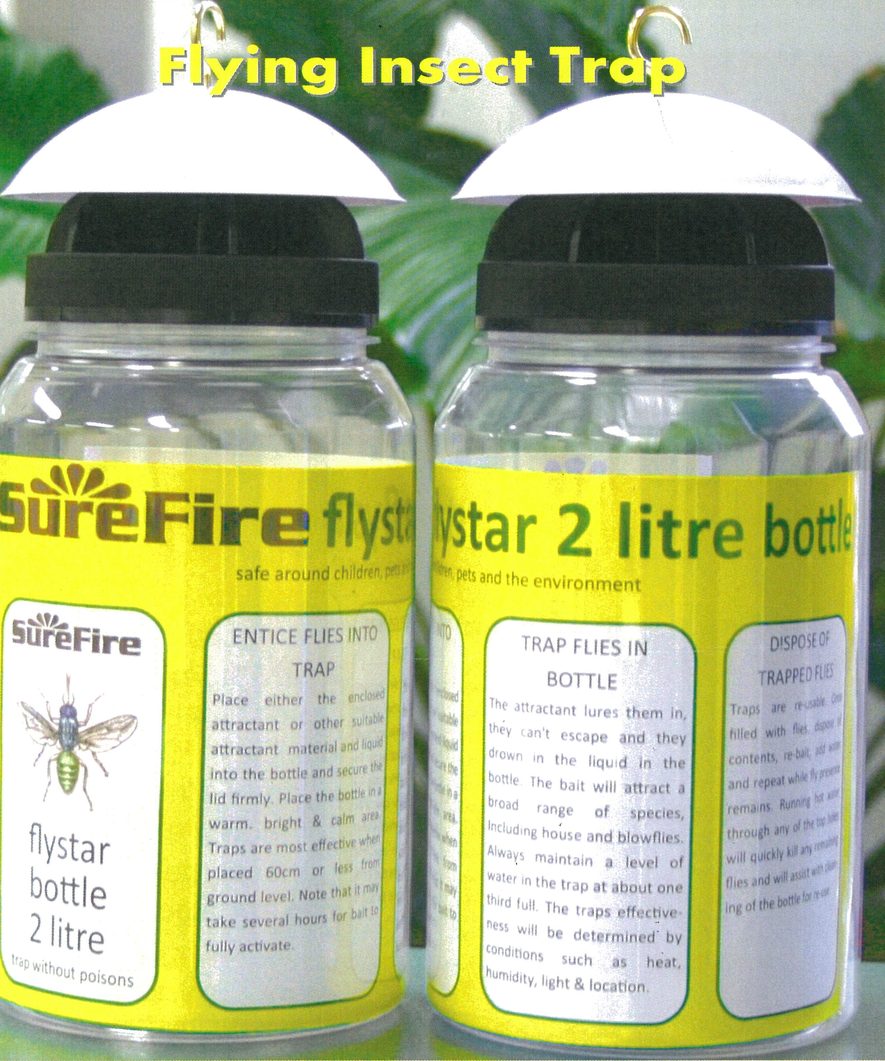 Two litre clear plastic bottle with non-toxic fly attractant included. This trap is easy to assemble, and goes to work immediately once the attractant is added along with a little warm water. Each bottle comes with a prepacked sachet of fly attractant, made from our unique blend of food-grade materials.