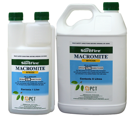 SureFire Macromite Miticide is a selective miticide for the control of plant-eating mite pests on apples, pears, apricots, nectarines, peaches and plums. When used as directed and applied to foliage it rovides quick knockdown through contact activity and good residual control. Due to its unique chemistry, mode of action and selective nature, SureFire Macromite Miticide is relatively inactive against beneficial and/or predatory mites and insects and is therefore compatible with IPM and resistance management programs.